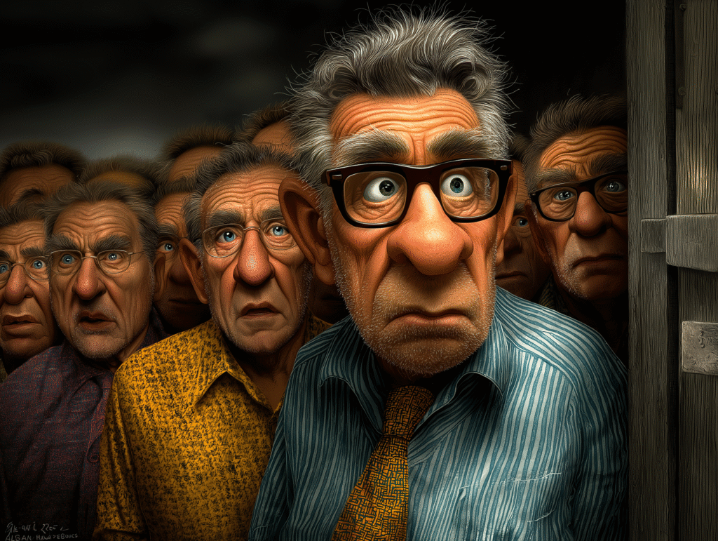 Fearful men, behind the glass, shaking at the sound